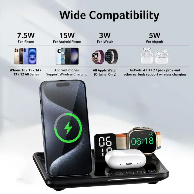 Charging station for multiple devices: allowing fast and simultaneous charging of multiple devices. It supports dual iPhone charging and also charges AirPod and iWatch. Additionally, it includes two wired ports (USB-A and USB-C) for charging headsets, smartphones and tablets. A truly versatile charging solution that eliminates the hassle of managing multiple chargers, offering you a neat and convenient charging environment
